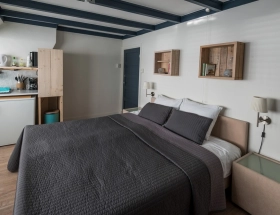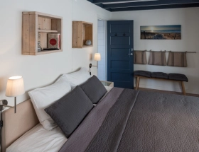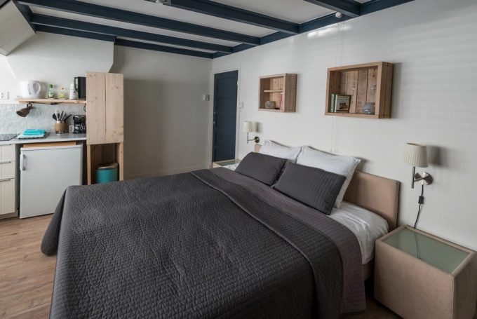 Kitchenette met 2 pits inductie kookplaat, alle benodigde keukengerei, waterkoker, koffiezetapparaat, koelkast met vriesdeel, woon/slaapkamer met groot 2 persoons boxspring (180x200) TV (flatscreen) eettafel voor 2 personen, grote badkamer met bad en douche, wastafel en toilet.