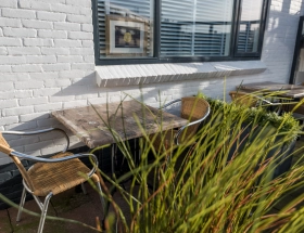 Entree - Hal, terras voor het huis , tuinmeubilair, parasol.